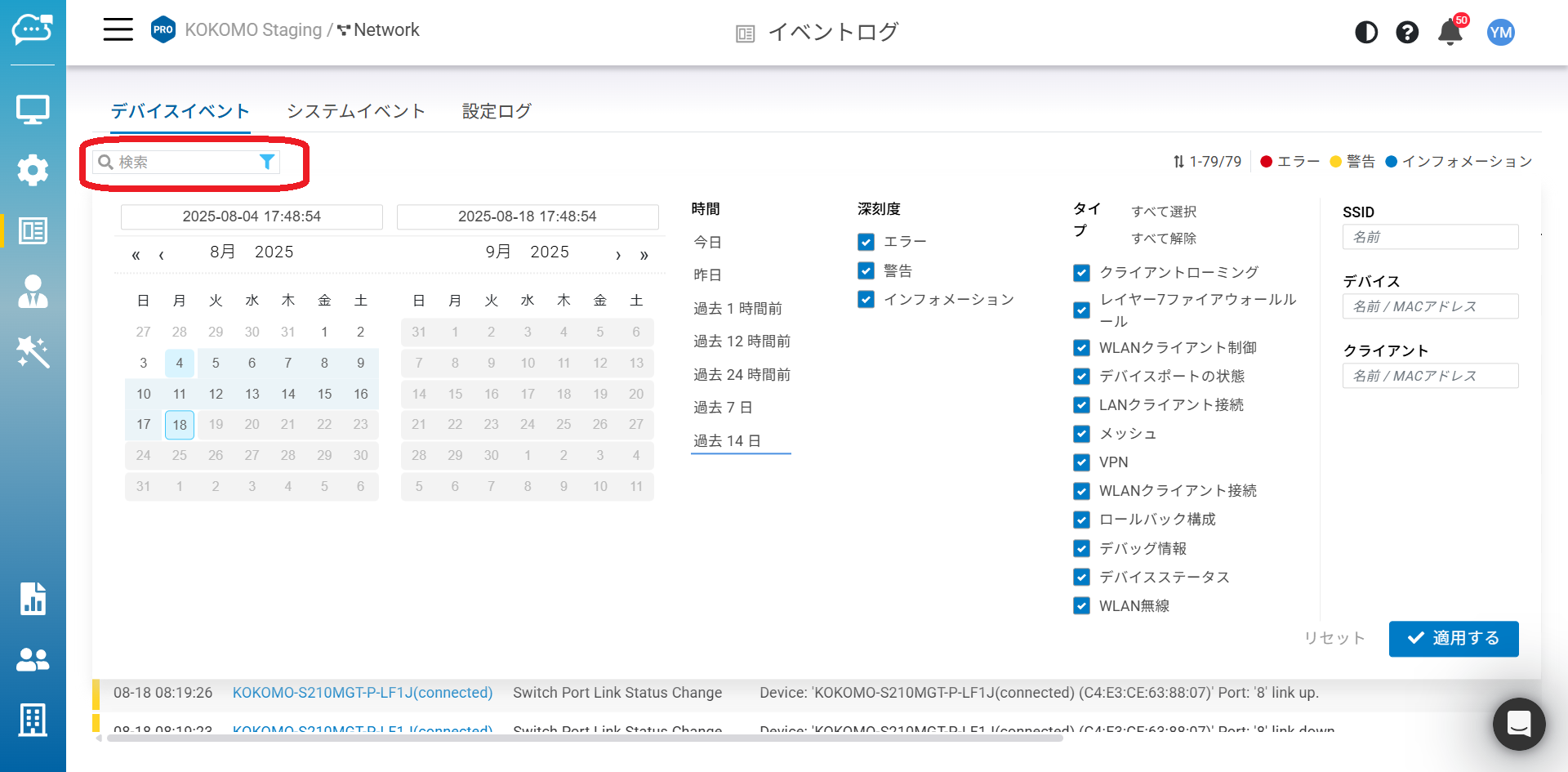 1つまたは複数のイベントタイプを選択し、SSIDやデバイス名/MACを入力するか、またはクライアントを選択すると、関連するログメッセージが表示されます。検索をカスタマイズしたら、「適用する」をクリックして検索を実行してください。