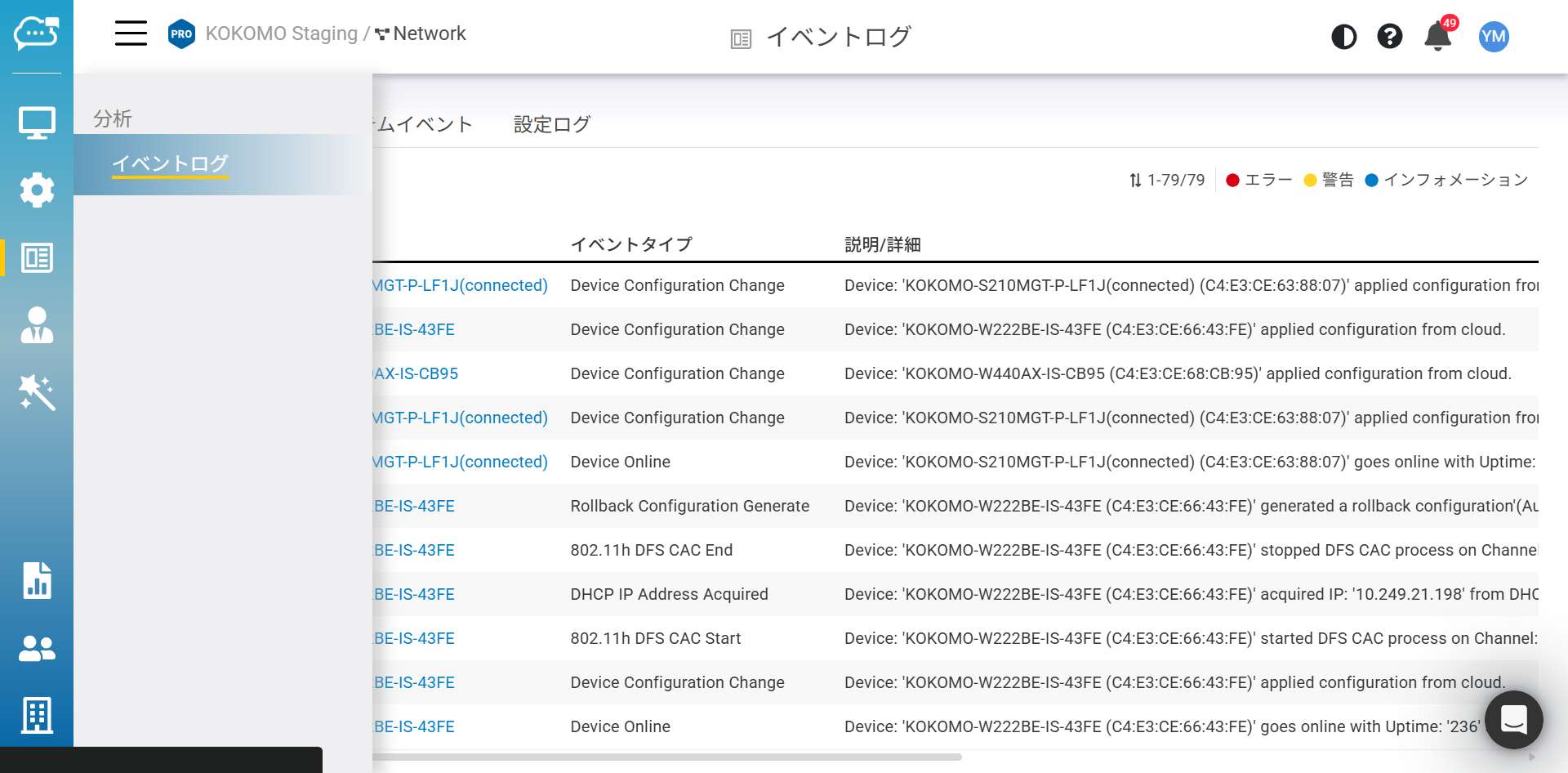 「分析」>「イベントログ」>「デバイスイベント」をクリックして、この画面にアクセスします。