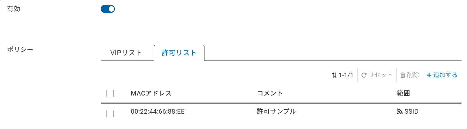 許可リストに追加したクライアントを有効にするには、当該SSIDの「アクセス制御」で「許可リスト」ポリシーを有効にしておく必要があります(デフォルトは無効)。