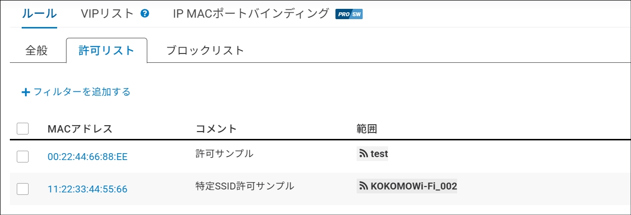 この許可リストには、「設定」>「アクセスポイント」>「SSID」>「アクセス制御」>「許可リスト」で追加した許可リストに登録済みのクライアントも併せて表示されます。これにより、すべての許可リストクライアントを単一のリストで簡単に管理できます。