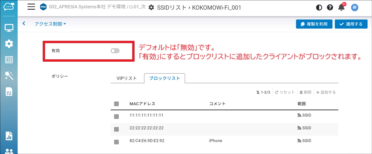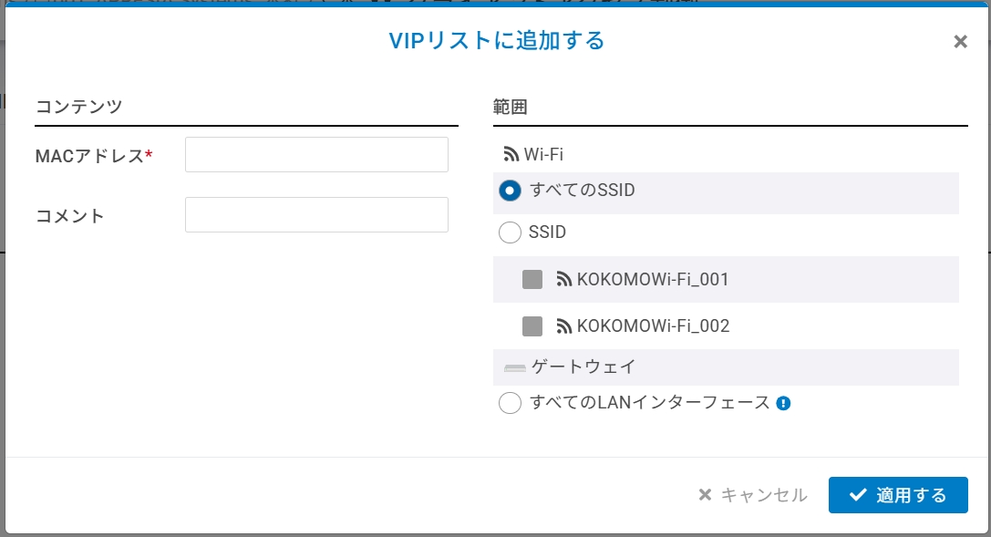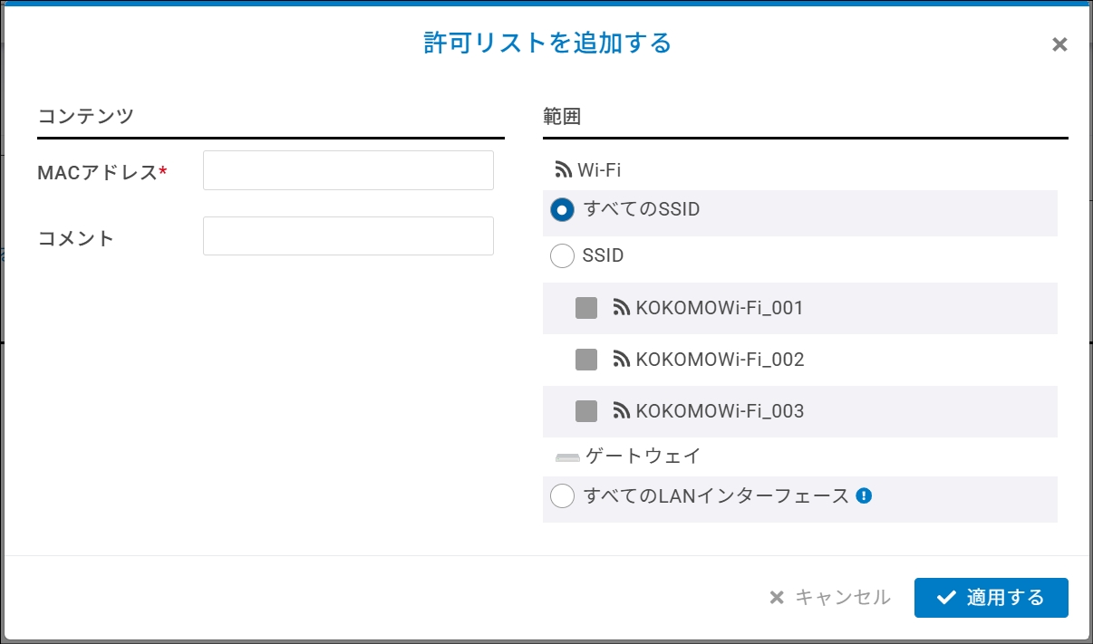 「MACアドレス」を入力し、「範囲」(ネットワーク内のすべてのSSIDまたはSSID単位)を選んで「適用する」をクリックします。