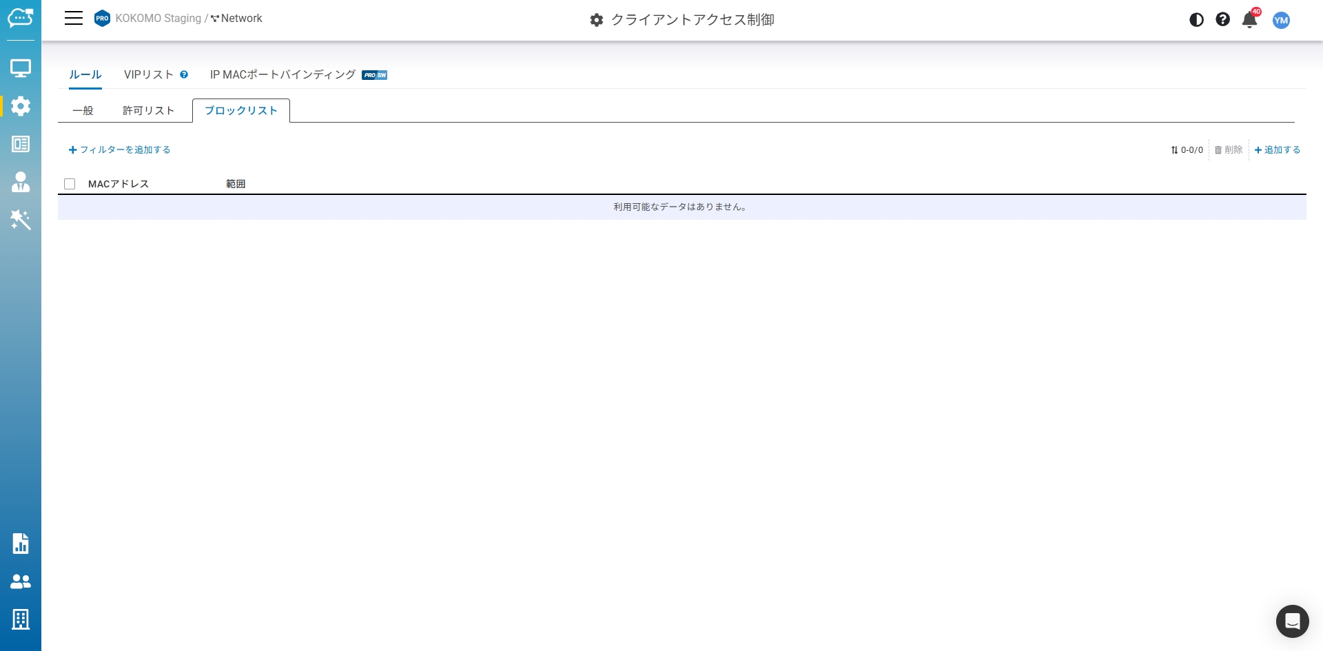 「設定」>「クライアントアクセス制御」>「ルール」>「ブロックリスト」でこの画面にアクセスします。