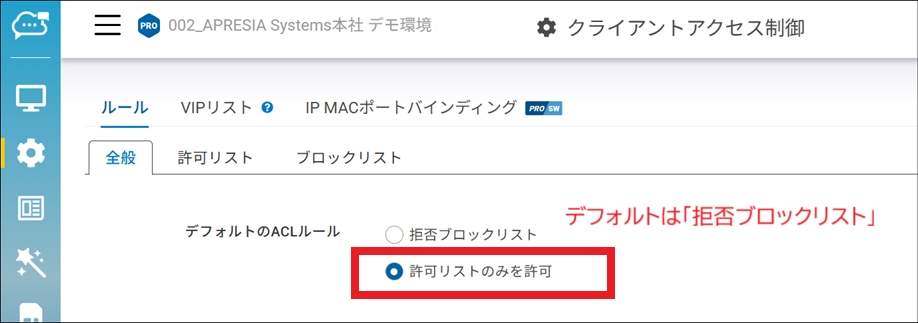 クライアントACLのデフォルト制御は「ブロックリスト」による拒否クライアントのブロック動作です。許可リスト(ホワイトリスト)で運用する場合には、デフォルトのACLルールを「許可リストのみを許可」に変更する必要があります。これにより、許可リストに登録されたクライアントのみが許可されます。