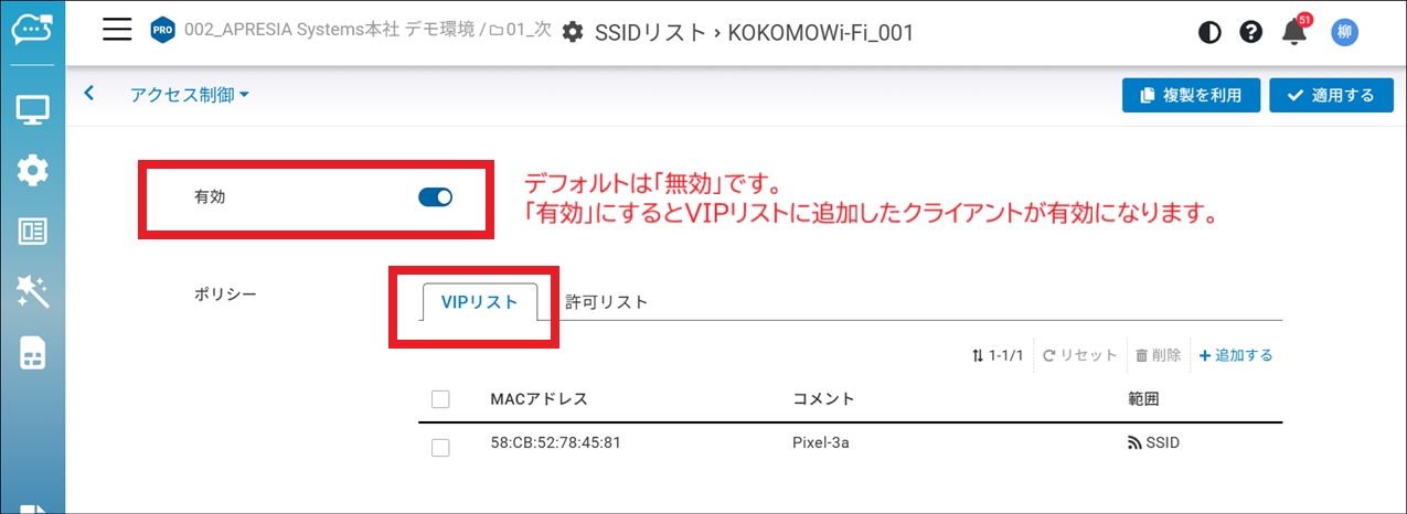 VIPリストに追加したクライアントを有効にするには、当該SSIDの「アクセス制御」で「VIPリスト」ポリシーを有効にしておく必要があります(デフォルトは無効)。
