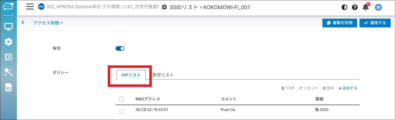 「設定」>「アクセスポイント」>「SSID」>「アクセス制御」で「VIPリスト」を選択します。