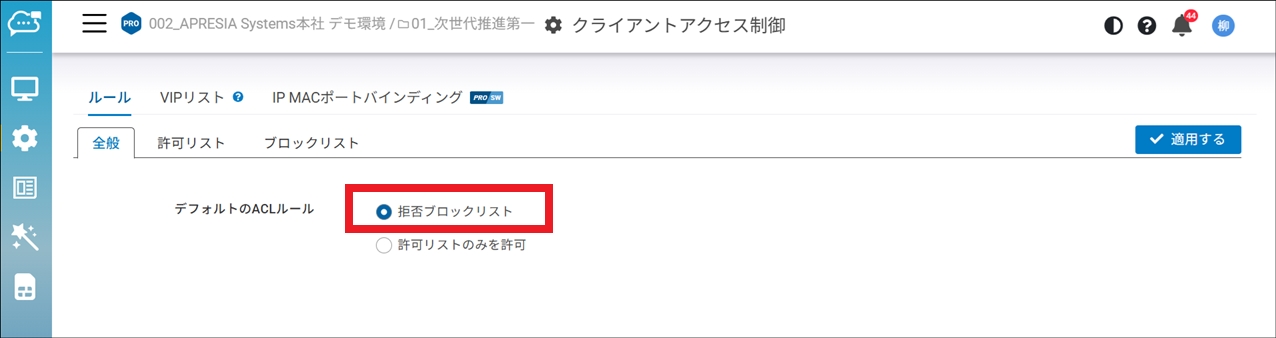 「設定」>「クライアントアクセス制御」>「ルール」>「全般」でデフォルトのACLルールを「拒否ブロックリスト」に設定します。(デフォルト)