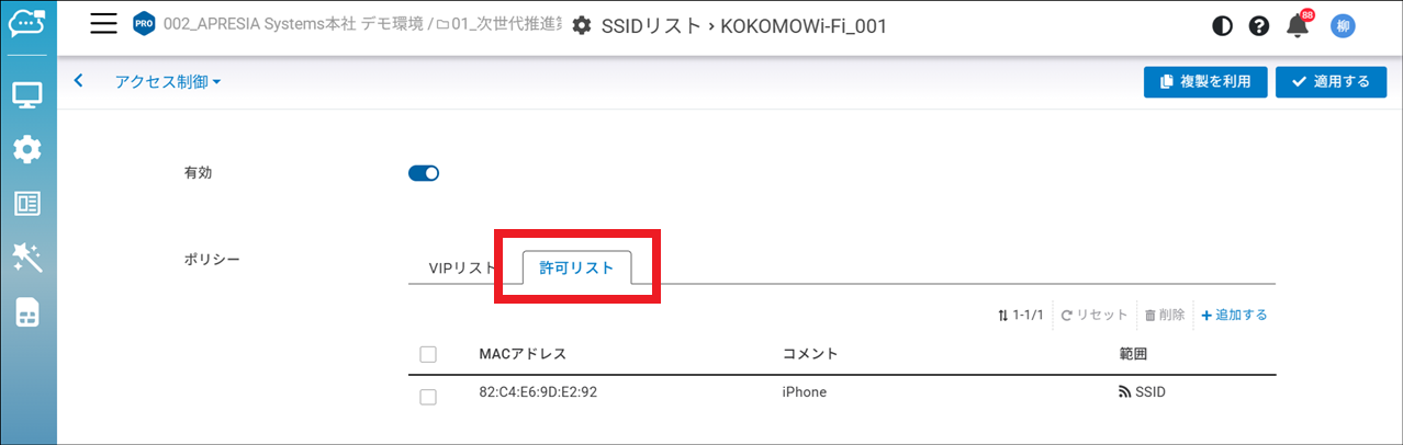 「設定」>「アクセスポイント」>「SSID」>「アクセス制御」で表示されるポリシーが「許可リスト」になります。