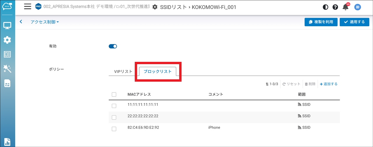 ブロックリスト追加後は、「適用する」をクリックして反映させてください。