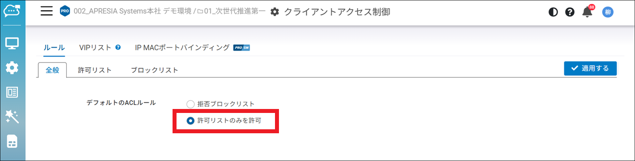 「設定」>「クライアントアクセス制御」>「ルール」>「全般」でデフォルトのACLルールを「許可リストのみを許可」に設定します。