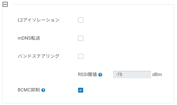 この値は、デュアルバンド無線クライアントが5GHz帯に接続するための最小RSSIを定義します。しきい値を下回る場合、2.4GHz帯のみ接続可能となります。推奨値は-60~-80です。
