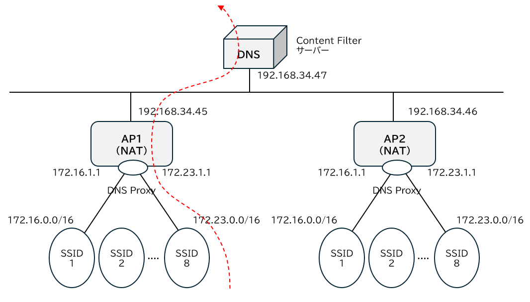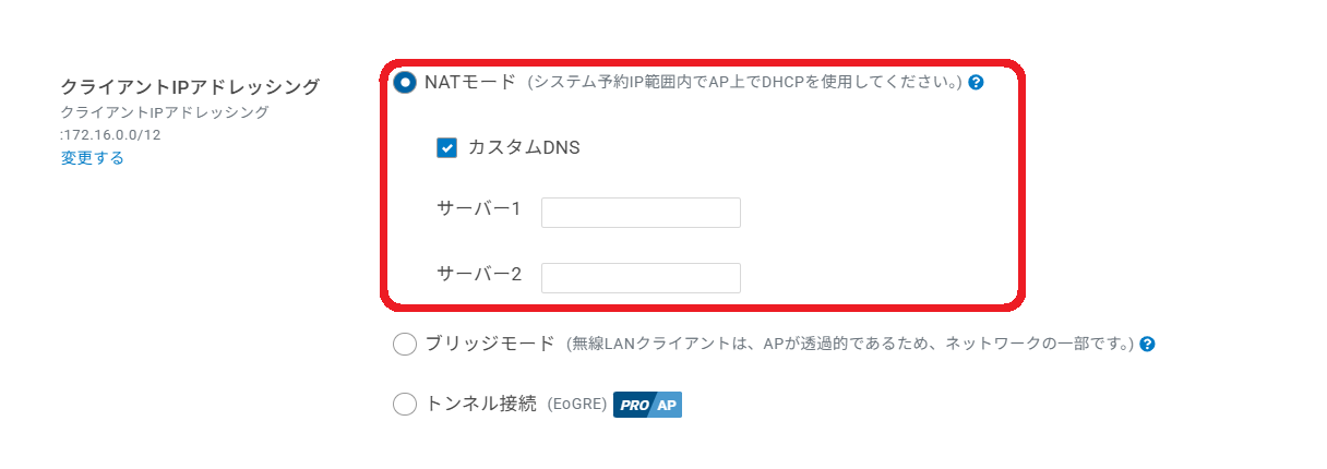 アクセスポイントのDNSサーバーを使用する代わりに、NATのSSID用カスタムDNSサーバーを設定できます。これは通常、NATのSSIDクライアントを、カスタムのコンテンツフィルタリング機能を備えたDNSサーバーへ転送したい場合に利用します。