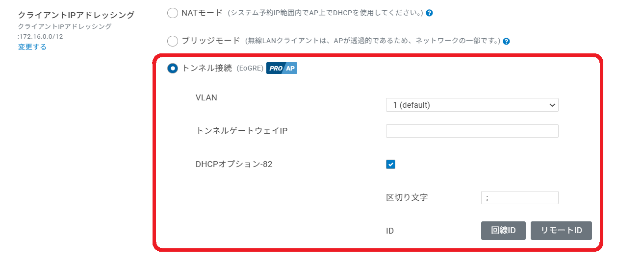 「クライアントIPアドレッシング」で「トンネル接続(EoGRE)」を選択します。