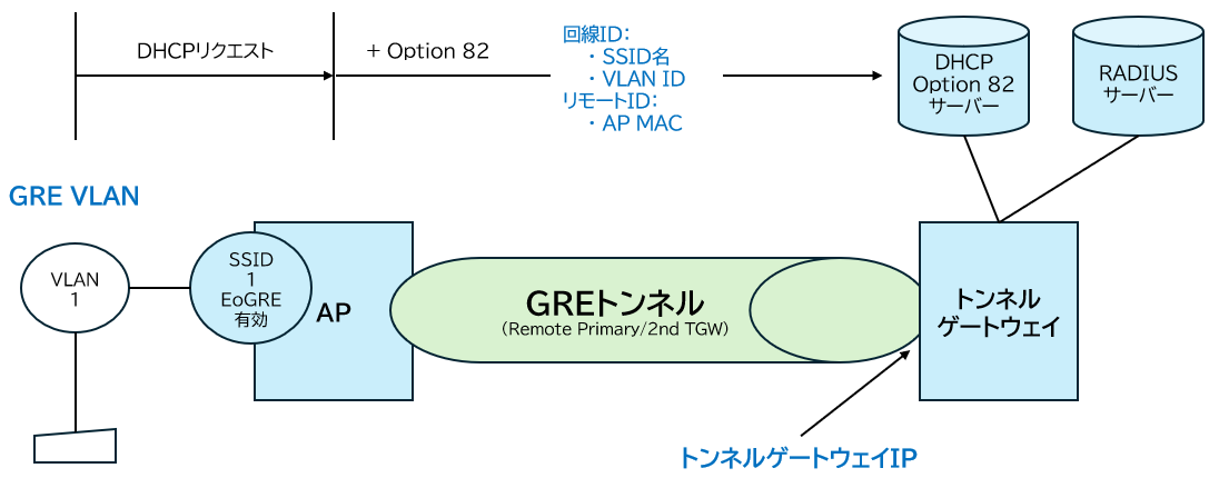 回線IDには、クライアントが接続しているESSID(SSID名)やVLAN IDが含まれ、リモートIDにはDHCP要求をリレーするアクセスポイント(アクセスポイントMAC、BSSID=無線MAC)が含まれます。