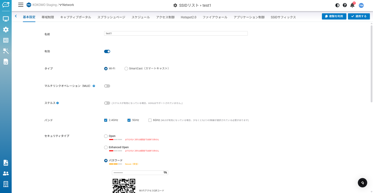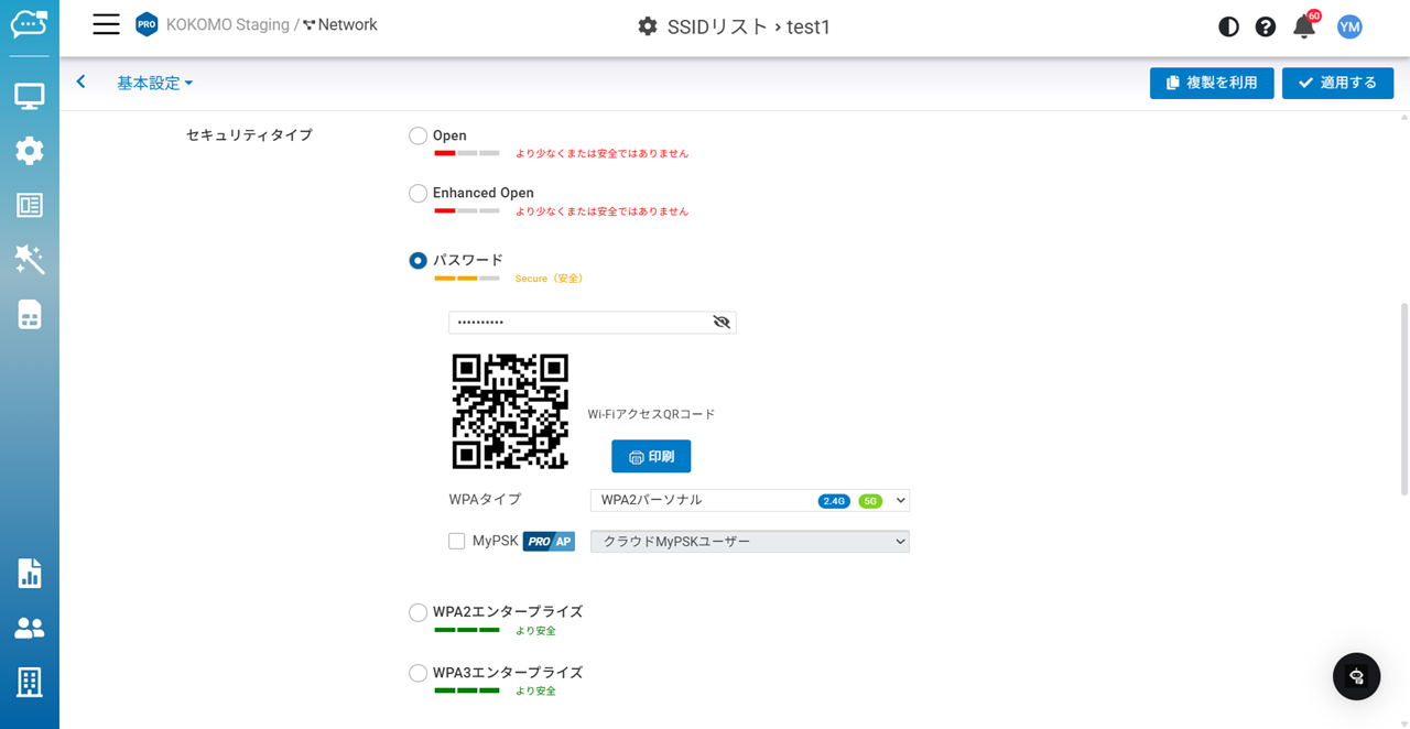 「WPA2エンタープライズ」および「WPA3エンタープライズ」のセキュリティタイプは「KOKOMO Cloud RADIUS」「カスタムRADIUS」以外は未サポートです。