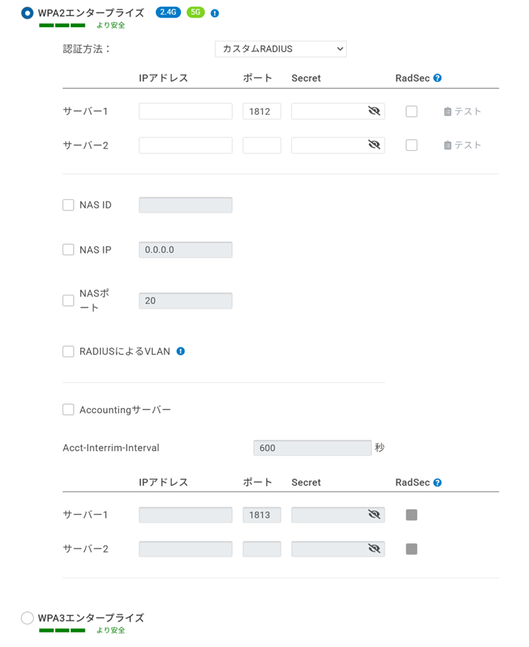 Accountingサーバー(任意):RADIUSアカウンティングサーバーの有無を設定します。