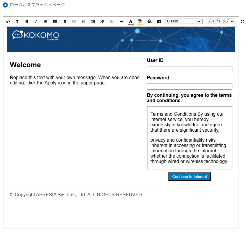 外部スプラッシュページURL:外部スプラッシュページでは、管理者は独自のWebサーバーでスプラッシュページをホストでき、KOKOMO Cloud側でホストする必要がありません。