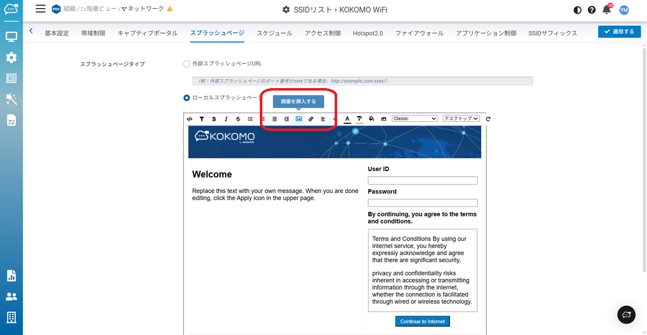スプラッシュページの設定後は、「適用する」をクリックしてください。