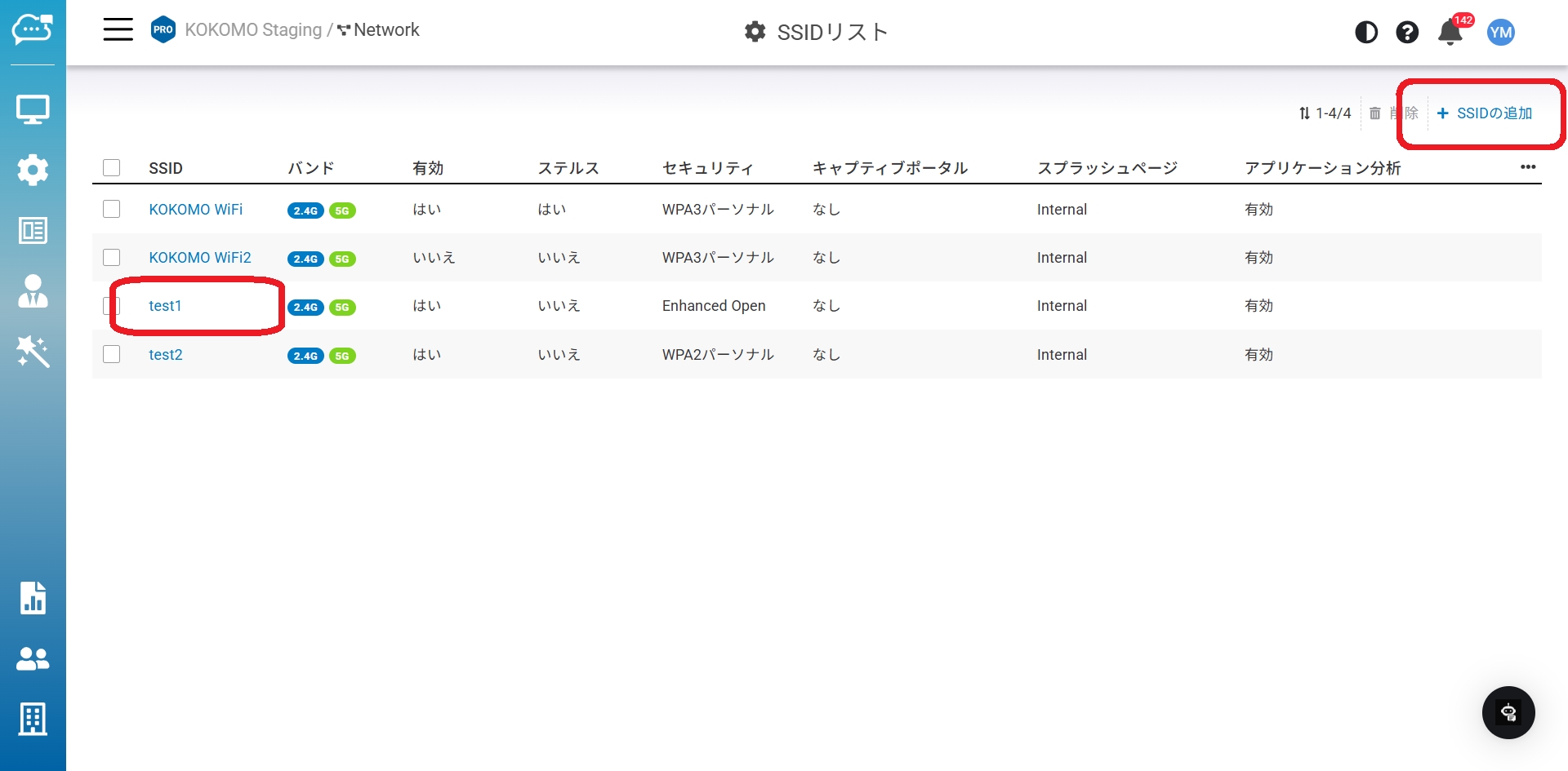 リストからSSIDを1つ選択します。SSIDがない場合は「SSIDの追加」で作成してください。