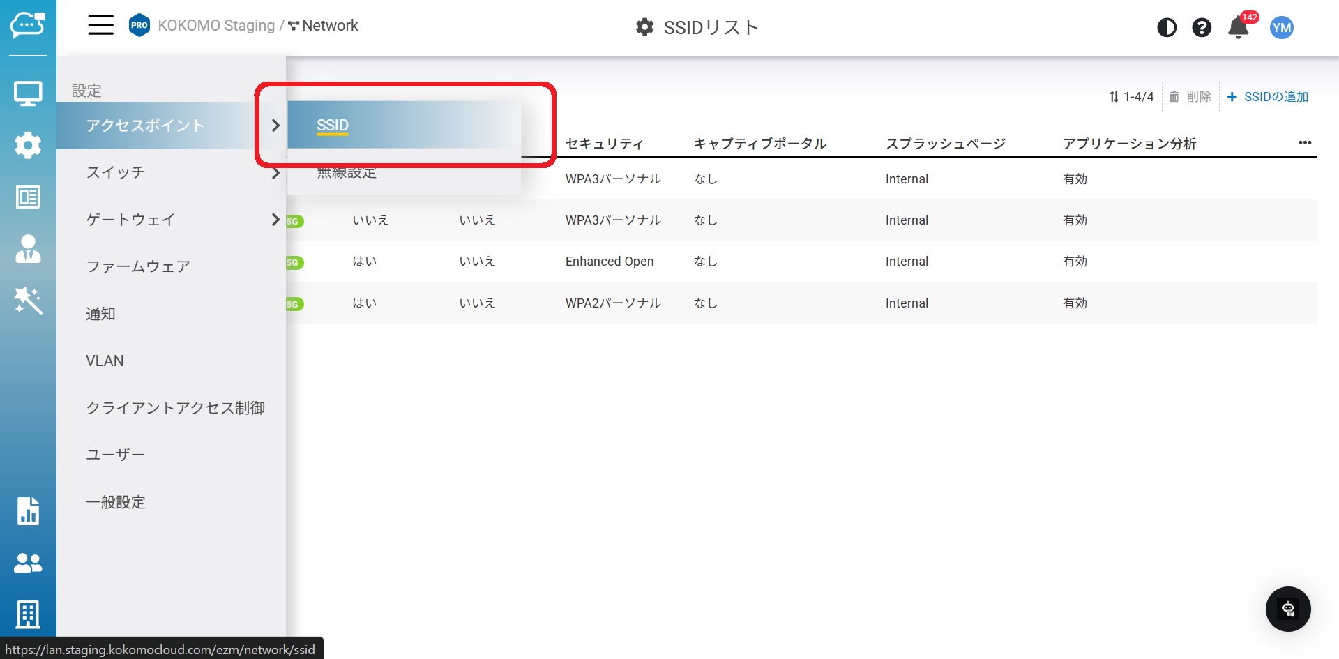 キャプティブポータルの設定を始める前にSSIDを作成しておく必要があります。「設定」>「アクセスポイント」>「SSID」に進みます。(「設定」がクリックできない場合はネットワークスコープであることを確認してください。)
