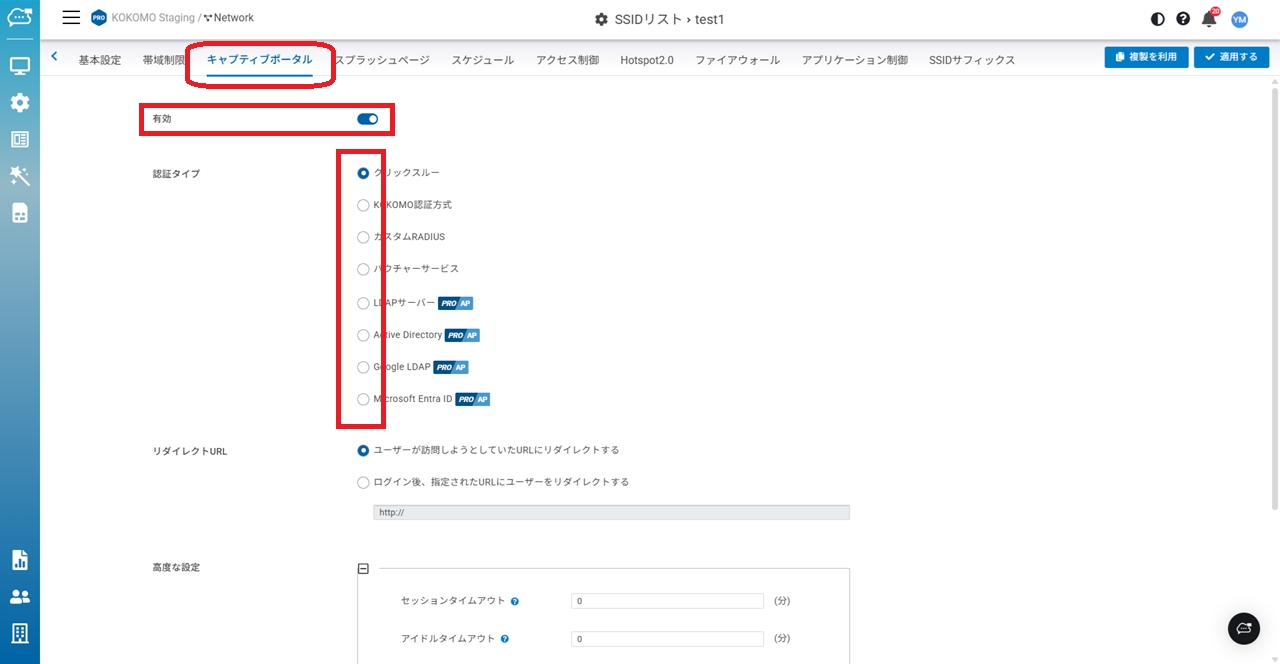 「キャプティブポータル」に進み、「有効」をクリックし、認証タイプを選択します。