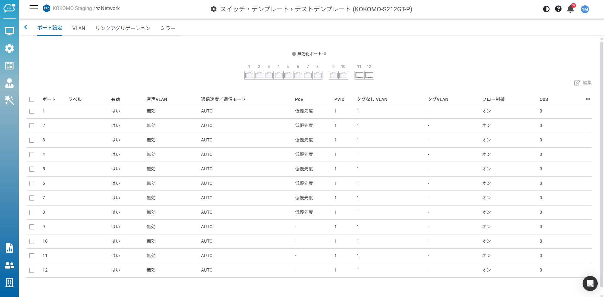 モデルごとに任意のテンプレートを作成し、テンプレートの「編集」をクリックして詳細を設定できます。設定内容はスイッチ詳細ページの設定と同様です。