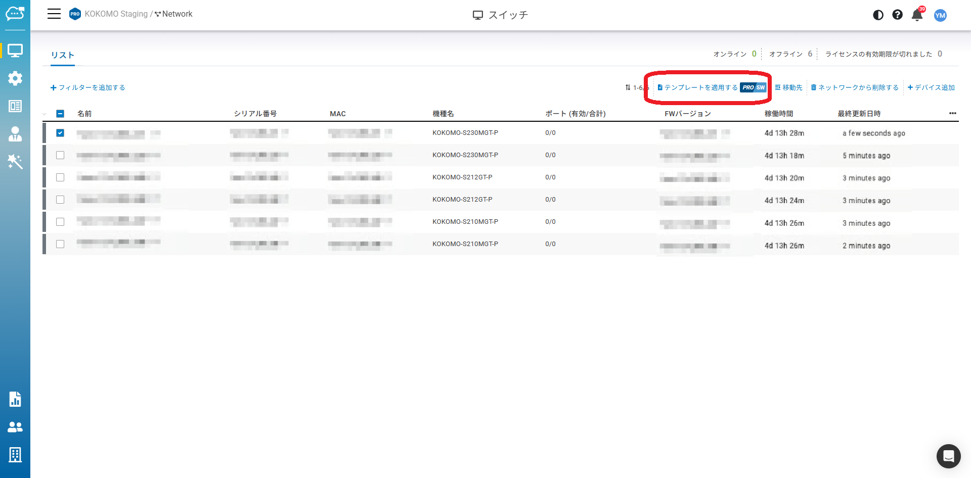 スイッチテンプレートをモデルが同一のスイッチに適用するには、「管理」>「スイッチ」から適用対象のスイッチを選択し、「テンプレートを適用する」を選択します。