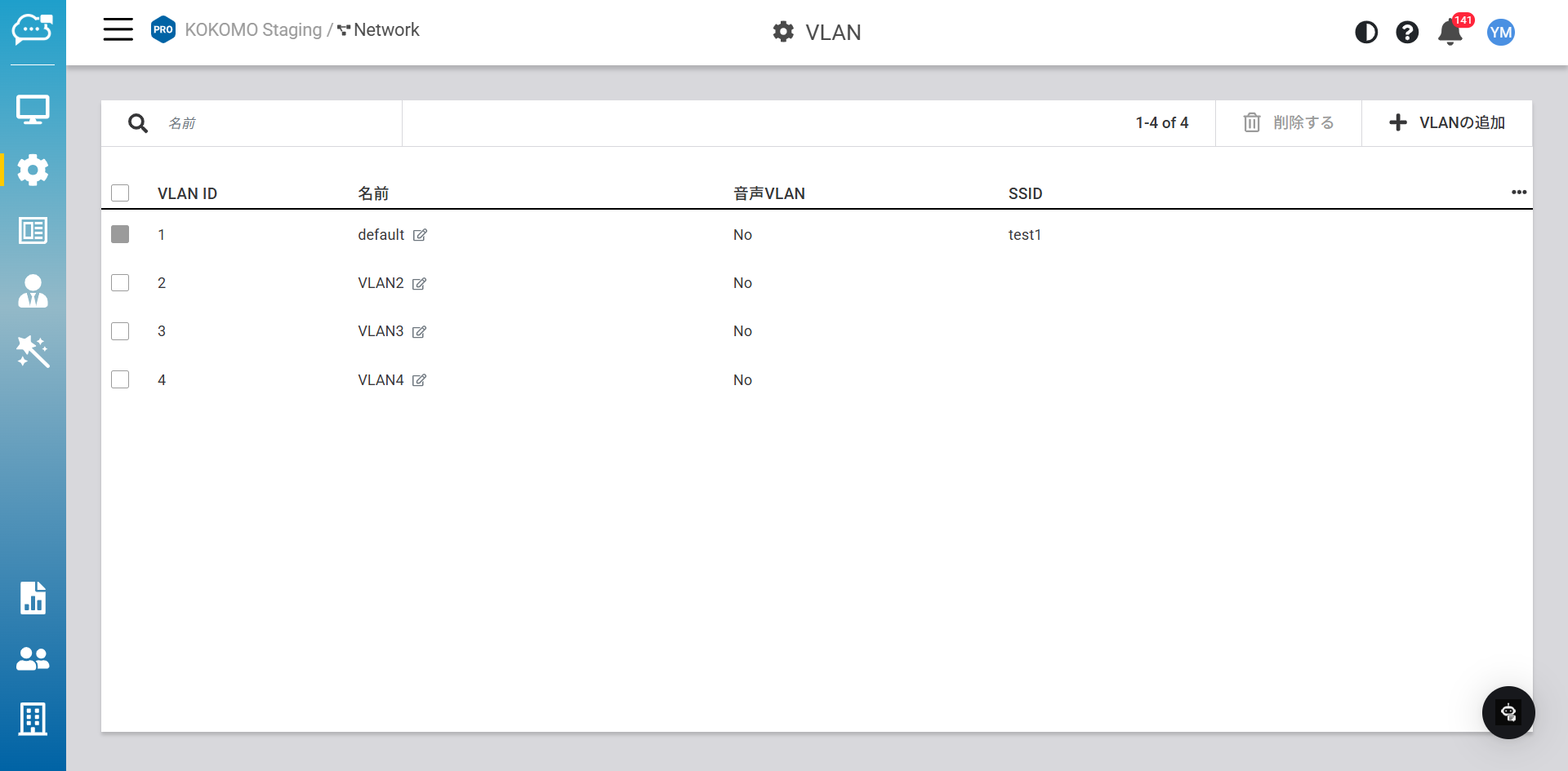 この画面でネットワークのVLAN追加と削除を行います。