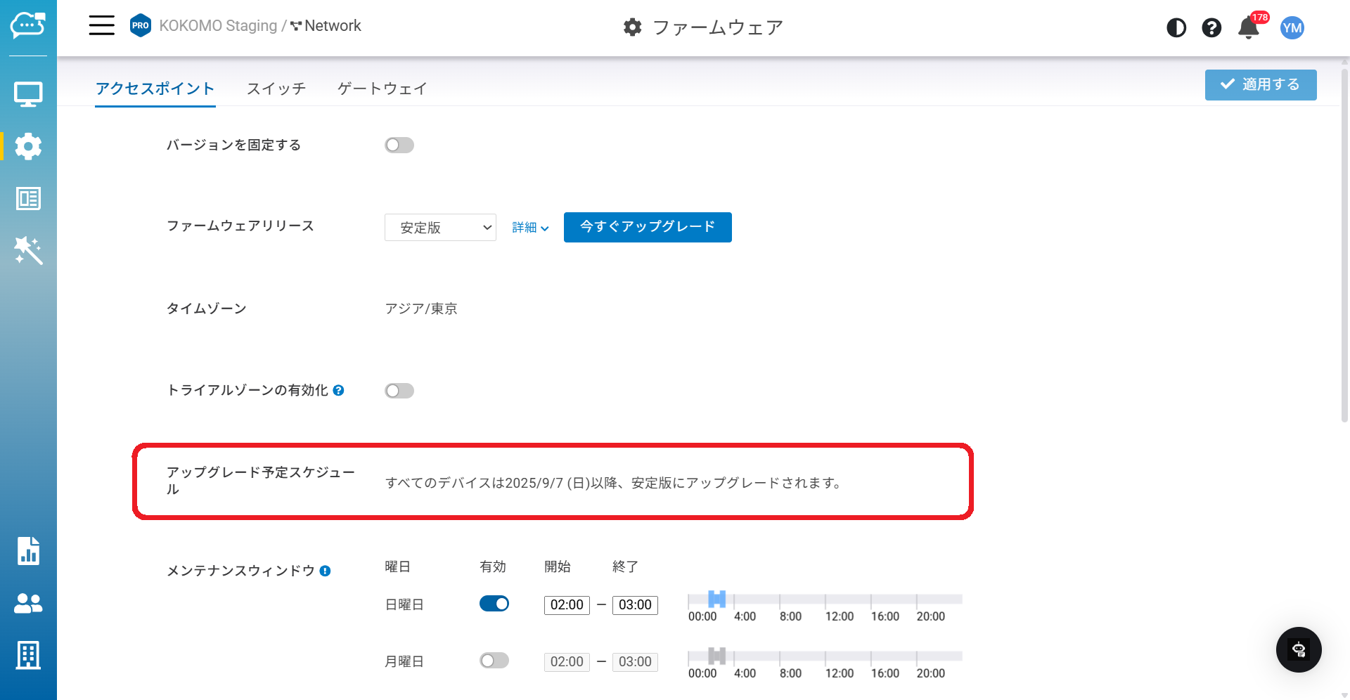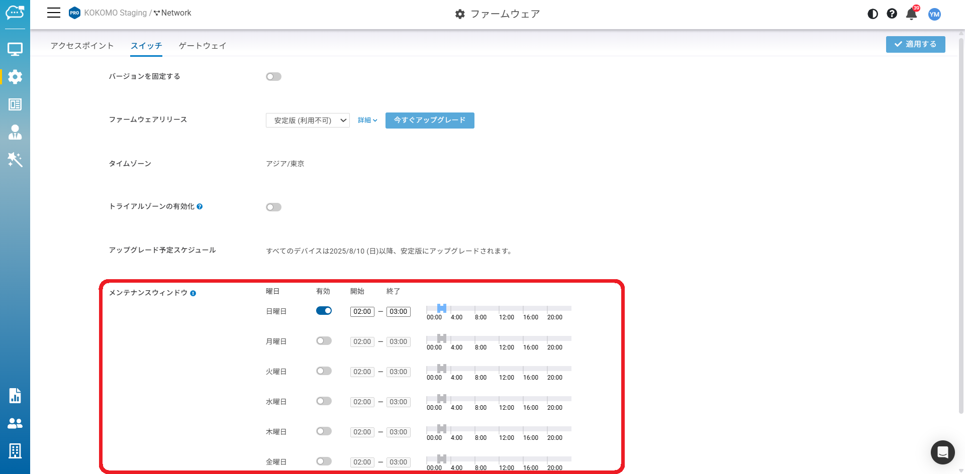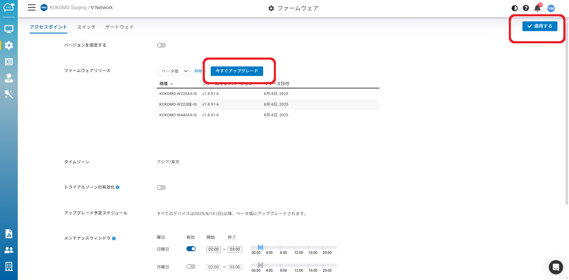 KOKOMO Cloudはデフォルトで自動アップグレードを有効にしており、毎週の「メンテナンスウィンドウ」の時間帯に従ってファームウェアをアップグレードします。