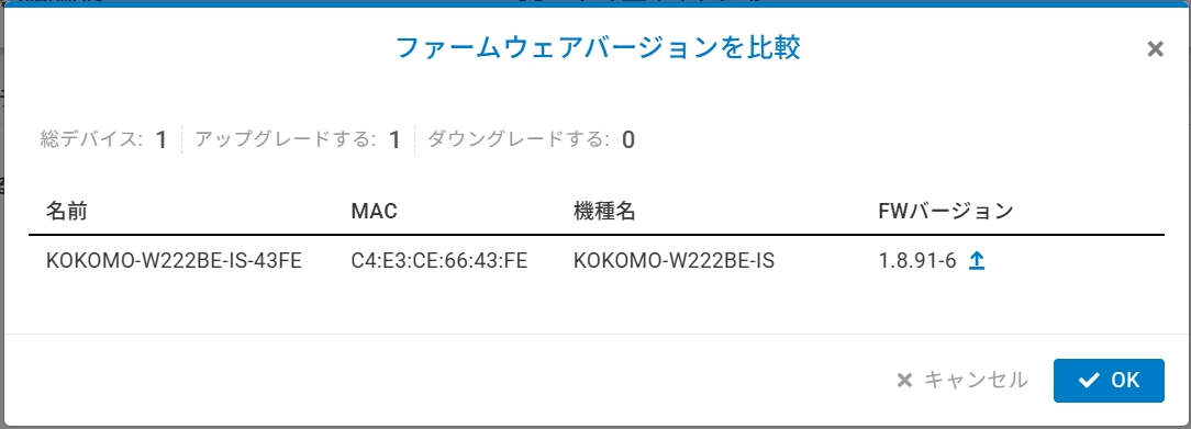 「比較」で、現在のネットワークデバイスのファームウェアバージョンと固定対象のファームウェアバージョンを比較できます。これにより、例えばアップグレード/ダウングレード対象のデバイスの数など、比較の概要が確認できます。