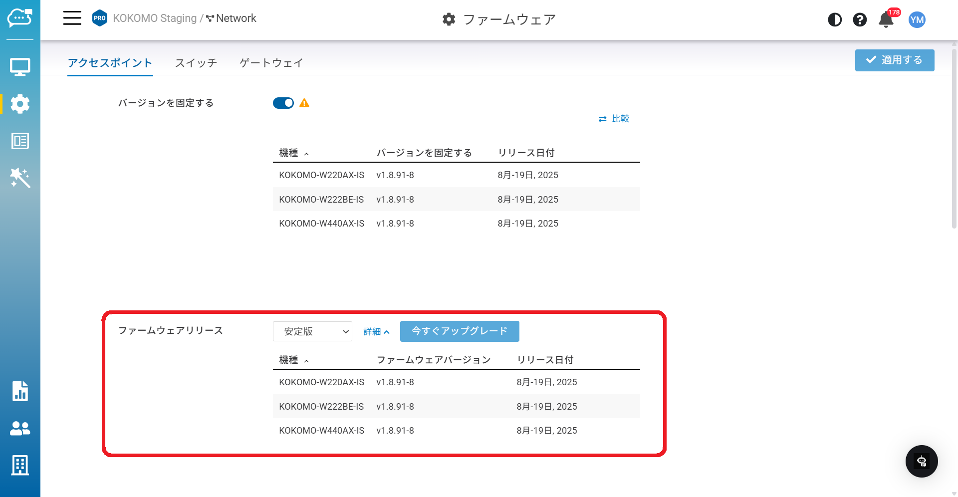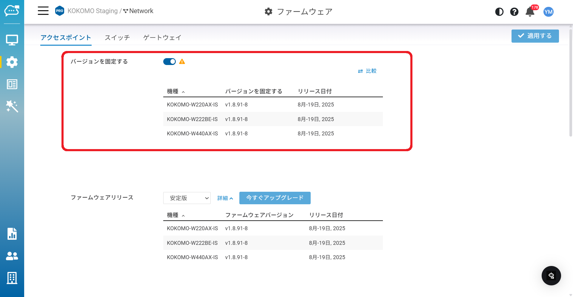 ファームウェアバージョン固定を有効にして「適用する」と、「ファームウェアリリース」のドロップダウンメニューからベータ版・安定版・前の安定版のいずれかを固定するバージョンとして選択できます。