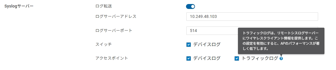トラフィックログでは、無線クライアント情報をリモートsyslogサーバーに送信します。これを有効にするとアクセスポイントの性能が大きく低下するので注意が必要です。有効化するにはsyslogサーバーが有効である必要があります。