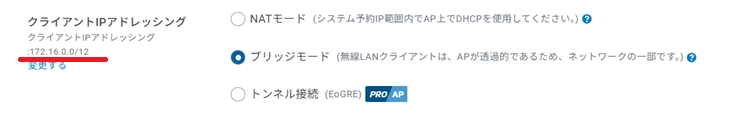 「設定」>「アクセスポイント」>「SSID」>「基本設定」>「クライアントIPアドレッシング」(NAT/ブリッジ)で、現在システムとして予約しているIPアドレス範囲が確認できます(以下の例では 172.16.0.0/12 が予約IPアドレス範囲です)。