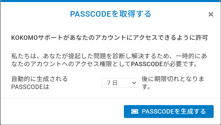 なお、生成されたパスコードは一定期間後に自動的に失効します。パスコードが失効すると、サポートチームはあなたのリソースにアクセスできなくなります。