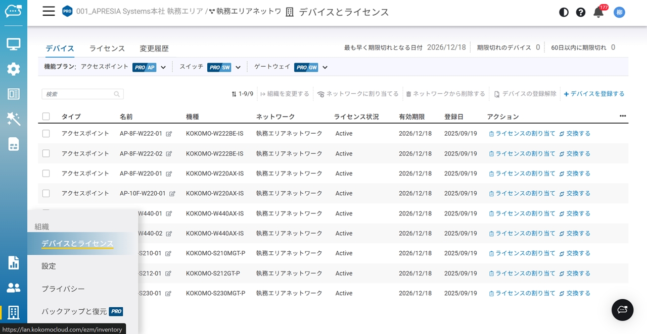 「組織」>「デバイスとライセンス」へ移動します。