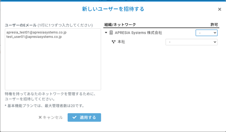 「新しいユーザーを招待する」ダイアログから、招待するユーザーのEメールアドレスを入力し、組織/ネットワークのアクセス権限(閲覧者、管理者)をプルダウンメニューで選択します。