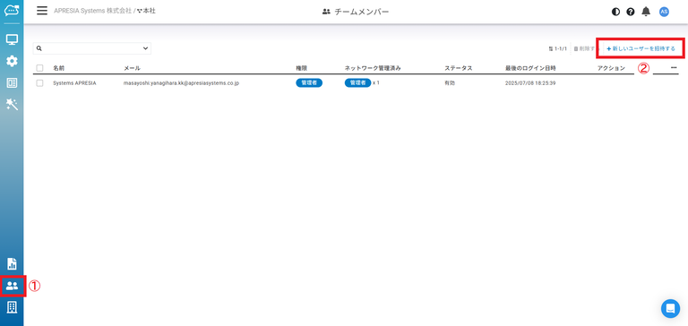 「チームメンバー」>「新しいユーザーを招待する」をクリックします。