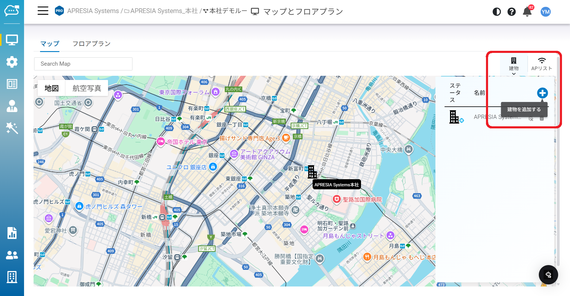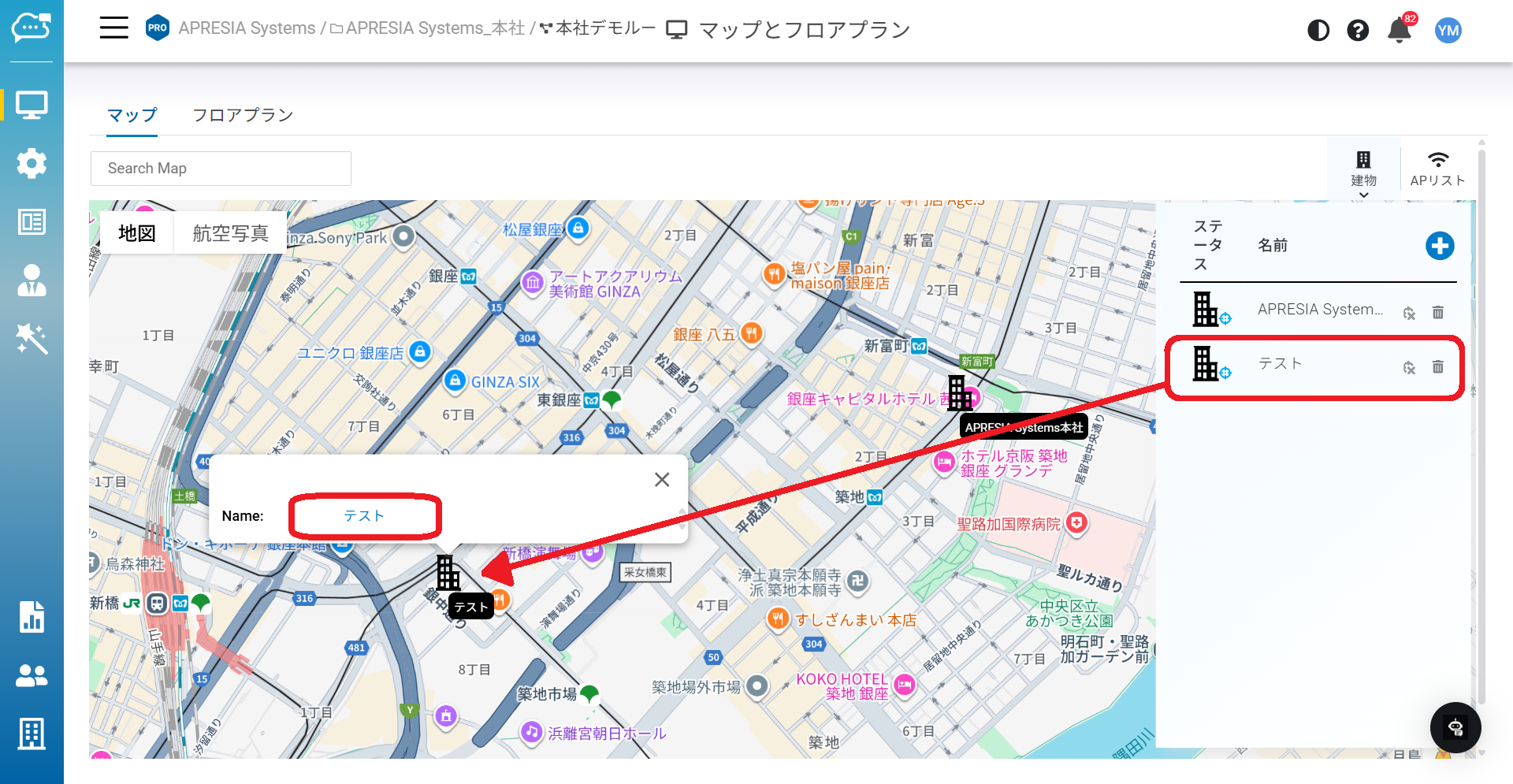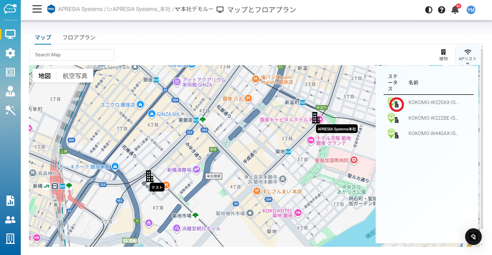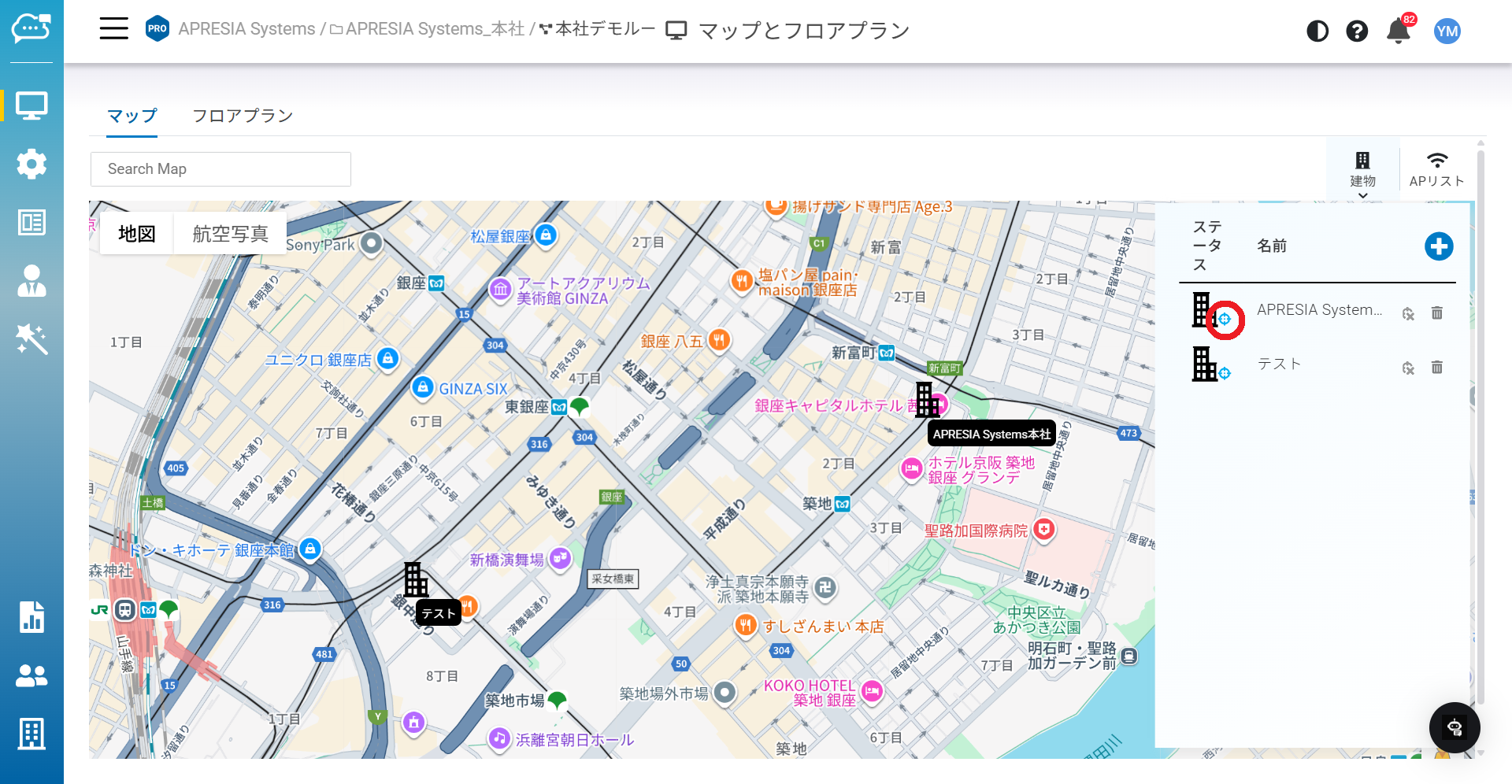 ダブルクリック:アクセスポイントリストの建物アイコンをダブルクリックすると、その建物のフロアプランに自動的に移動します。