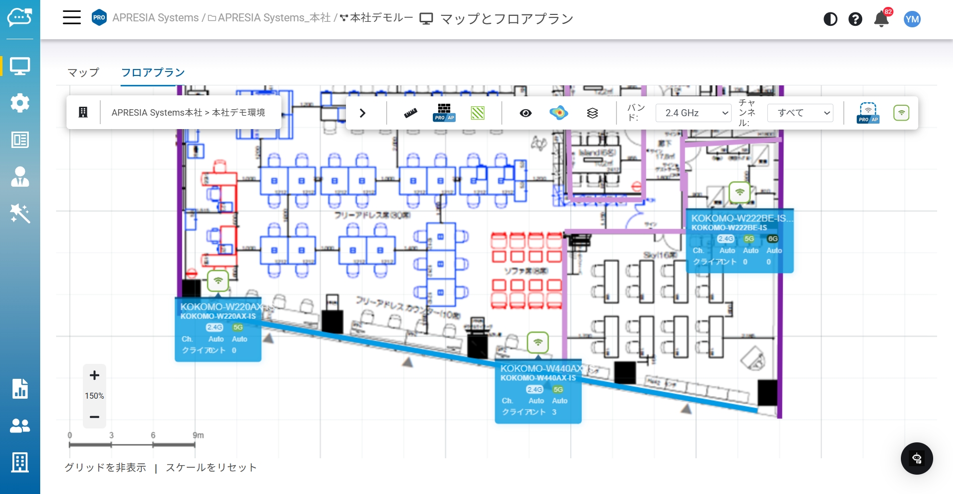 この画面では、世界地図上でデバイスの位置が特定され、空間とKOKOMOデバイスの関係性を確認できます。マップは建物やアクセスポイントの可視化を提供するものです。