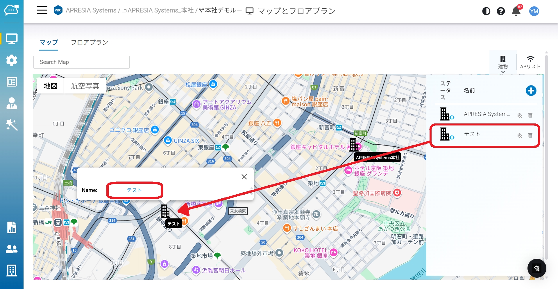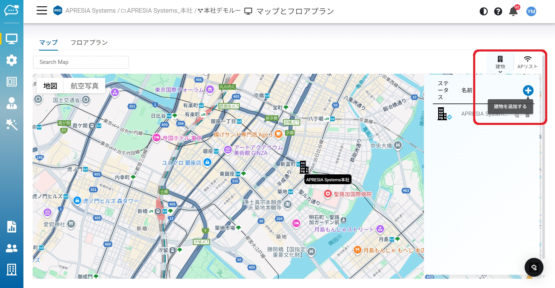 建物は作成後、リストに追加されます。追加された建物をマップ上にドラッグできます。 建物アイコンをシングルクリックするとハイパーリンクが表示され、フロアプランの編集が可能になります。