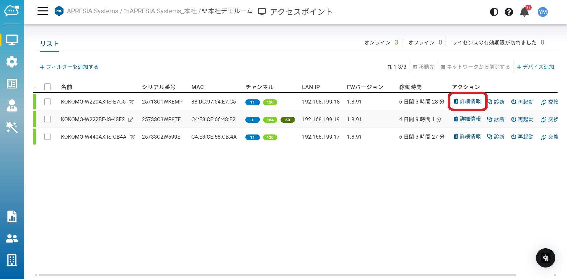 アクセスポイントごとに、さらに詳細なシステム設定や微調整が可能です。また、KOKOMO Cloudはアクセスポイントが定期的に報告する多くのデータを収集・集約します。洗練されたグラフや表をアクセスポイントの詳細ページで確認でき、アクセスポイントの監視や追跡を容易にします。すべての詳細を確認するには、アクセスポイントリストのページで該当する行にマウスカーソルを合わせます。「詳細」ボタンが表示され、クリックするとアクセスポイント詳細ページが開きます。