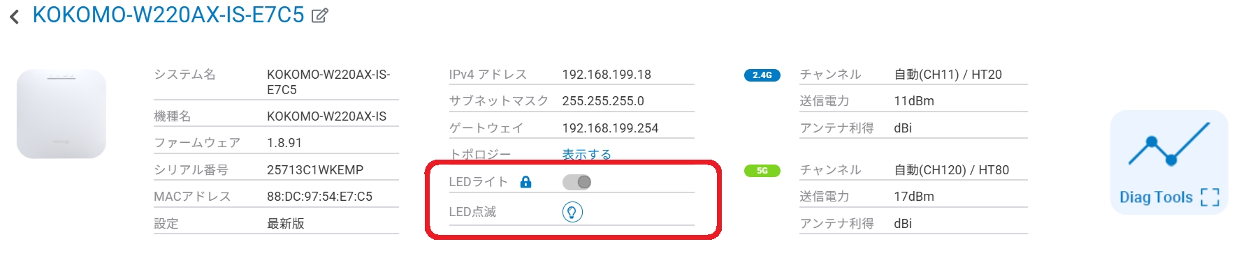 アクセスポイント詳細ページの上部には、LEDを即時に制御できる2つのボタンがあります。