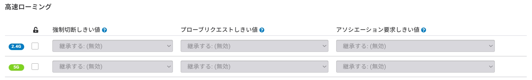 バンドのセクションでは、個別の無線設定が可能です。デフォルトではネットワーク全体の無線設定が適用されます。デフォルトとは異なるアクセスポイントの無線設定にしたい場合は、カスタム値でオーバーライドできます。