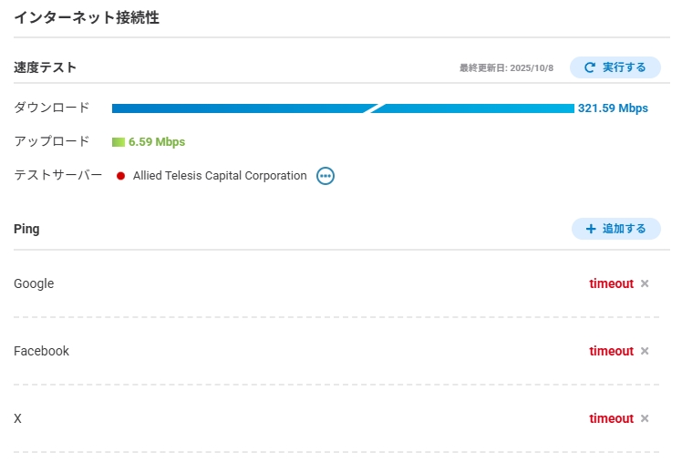 ping:デフォルトで3つのサーバーが指定されており、レイテンシの変化を確認できます。ユーザーが独自のサーバーを指定することも可能です。