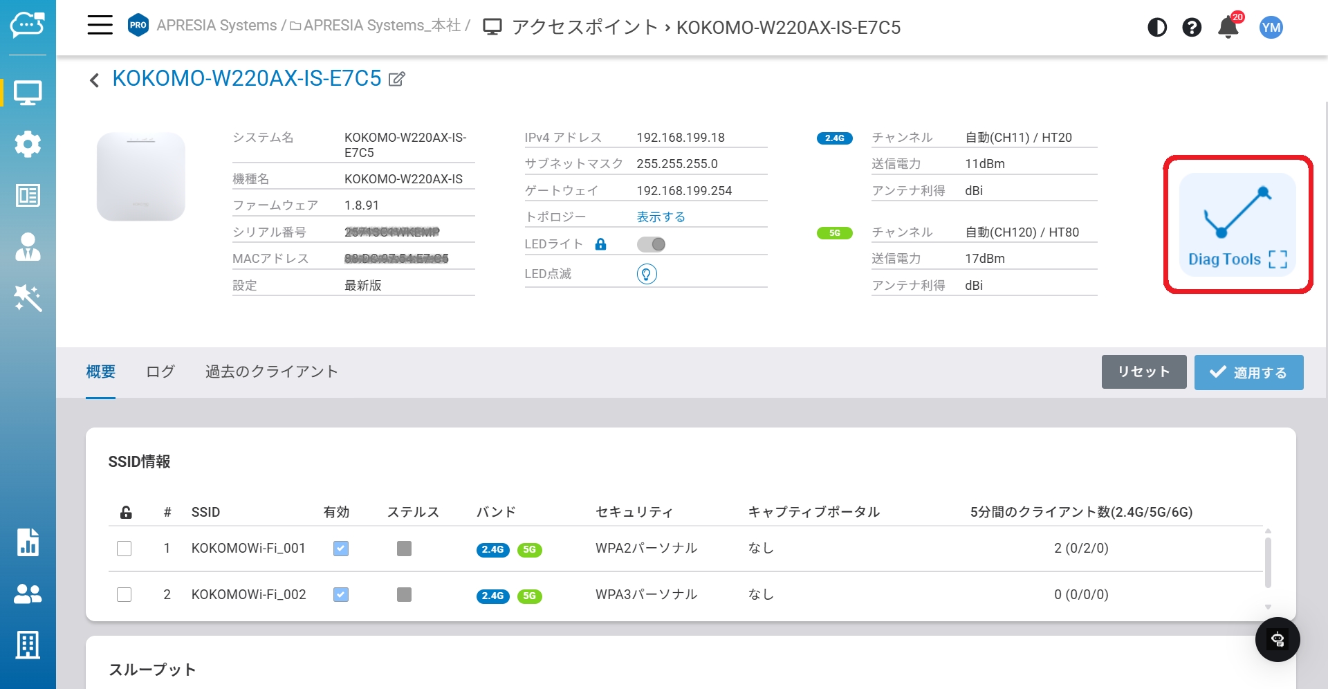 アクセスポイント詳細ページの「診断ツール(Diag Tools)」アイコンをクリックして起動します。