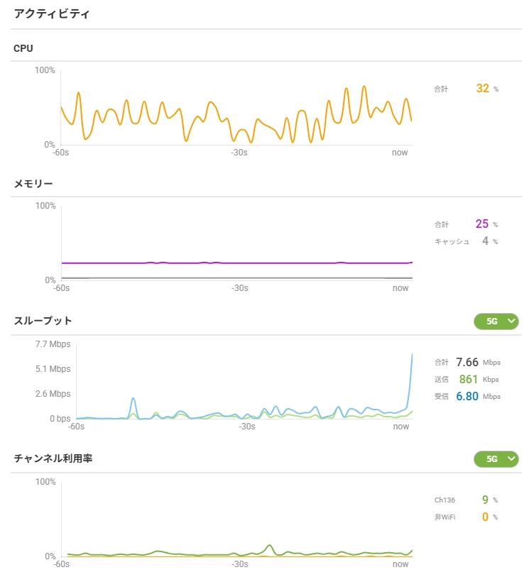 現在の情報を示します。「非Wi-Fi」チャネル利用率(%)も表示することで、総チャネル利用率のうちどの程度が非Wi-Fi由来であるかを把握できます。これにより、ユーザーは干渉が他のアクセスポイントによるものか、あるいはチャネル環境が混雑していてホワイトノイズが多いのかを判断できます。