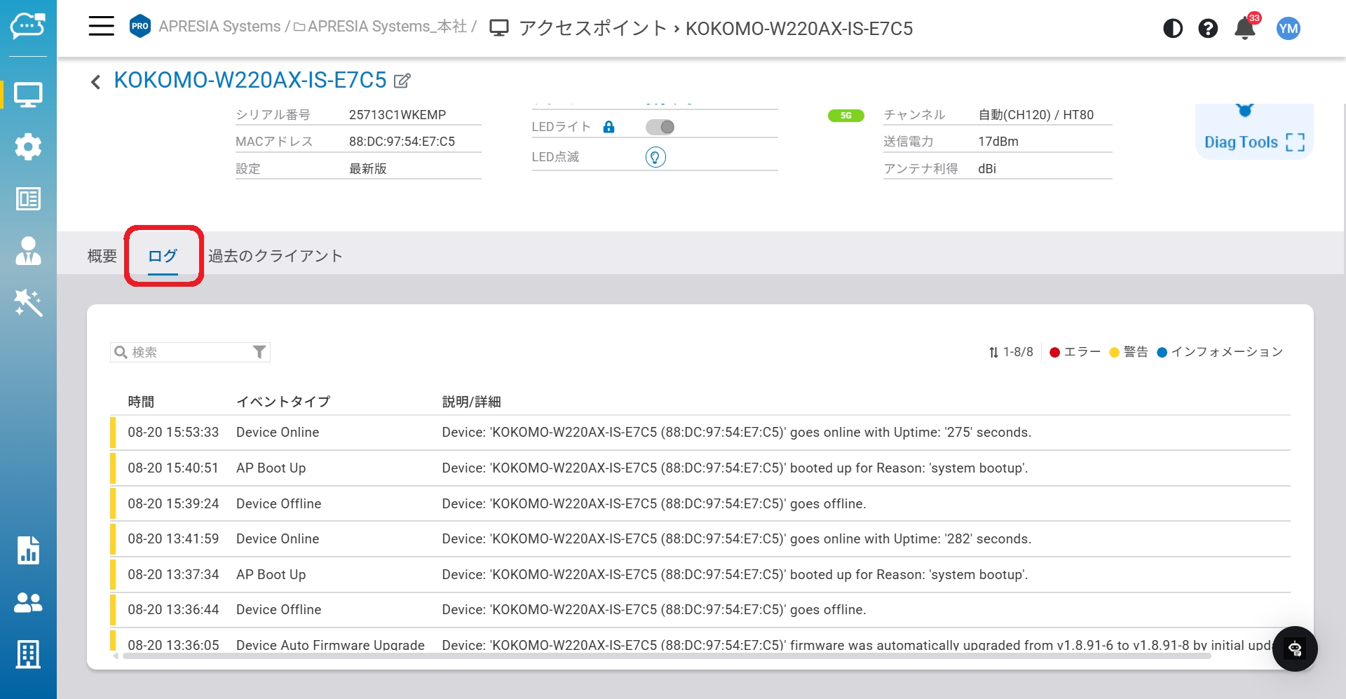 KOKOMO Cloudのログには、複数のロギングサブシステムがあり、それぞれデータ保持期間やエクスポートのオプションが異なります。デバイスイベント、システム設定、分析などのデータセットは、それぞれ全く異なる目的(ビジネスインテリジェンス、運用、リスク管理など)で使用されており、ネイティブのロギング機能に反映されています。「ログ」タブのページでは、現在のアクセスポイントのすべてのデバイスログがリスト表示されます。ネットワーク全体のイベントを追跡したい場合は、「デバイスイベント」を参照してください。
