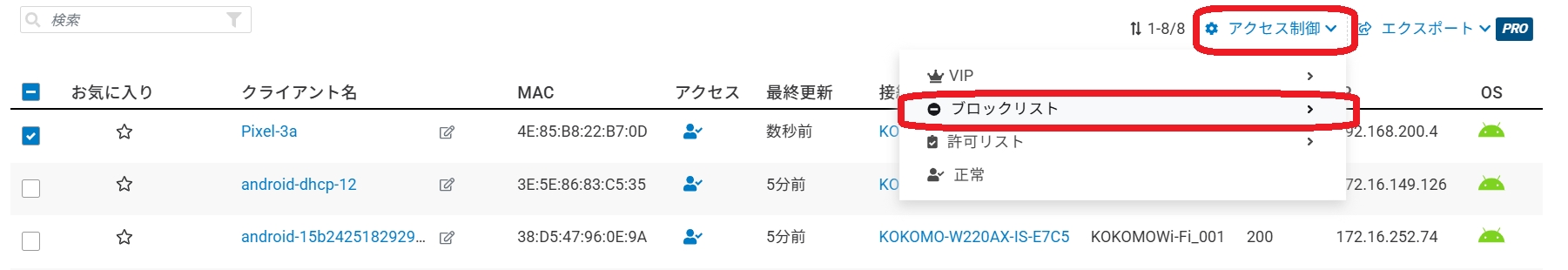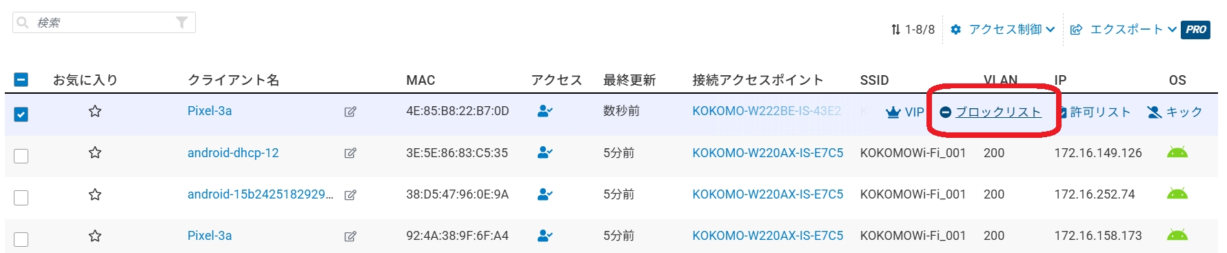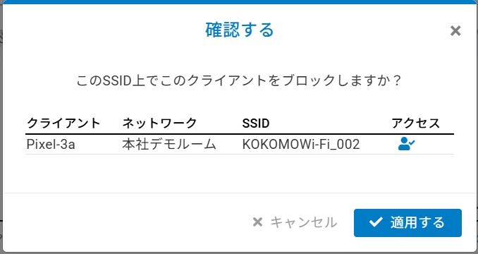 現在のSSIDで接続クライアントをブロック(ブロックリストへの追加)できます。