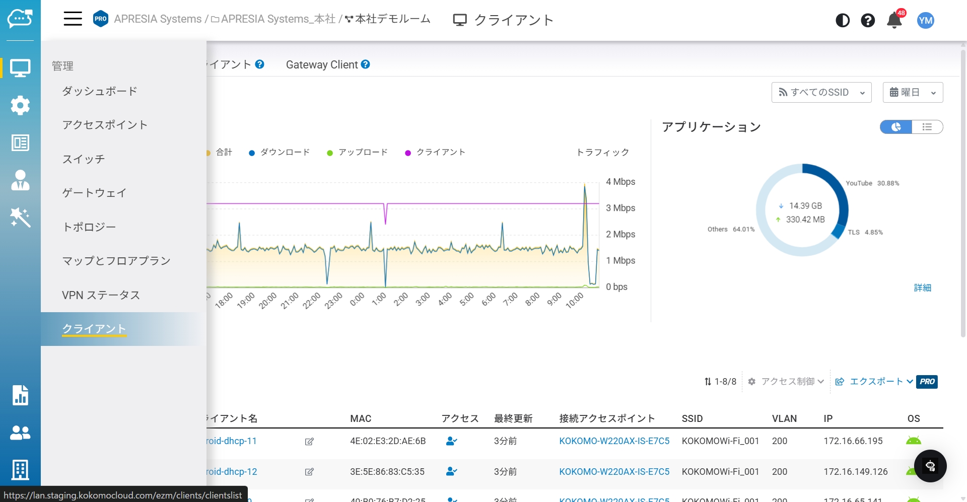KOKOMO Cloudでは、組織/階層ビュー/ネットワーク内の接続クライアントに関する情報を収集した管理ビューを提供します。