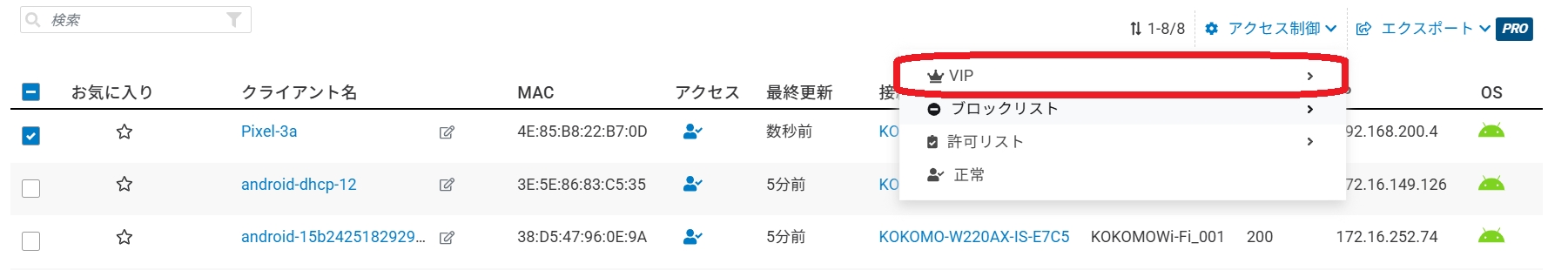VIPリストから削除したい場合は、ブロックリストや許可リストの設定と同様に、「設定」>「アクセスポイント」>「SSID」>「アクセス制御」>「VIPリスト」で表示されるVIPリストからMACアドレスを削除してください。