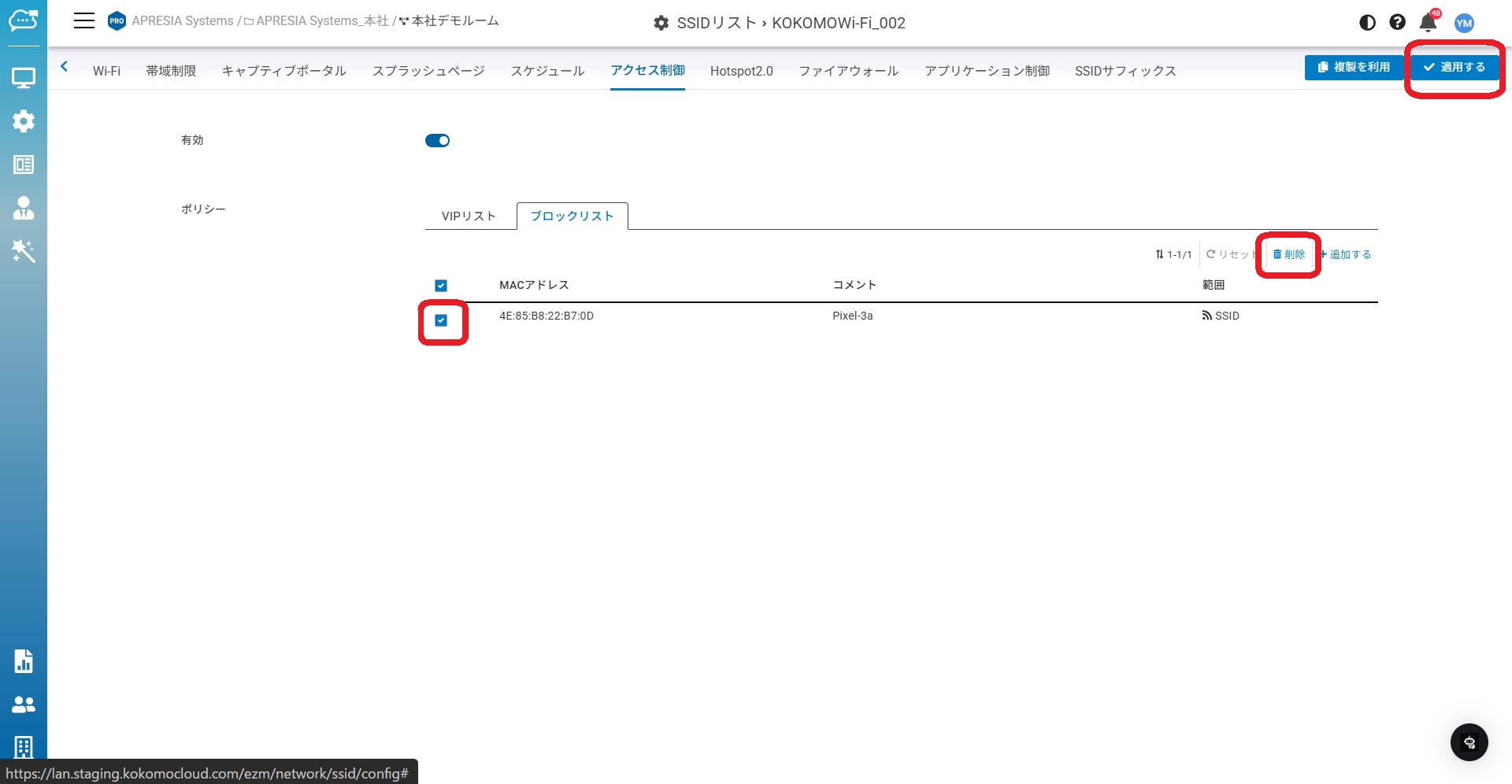 リストに追加したクライアントをブロックするには、当該SSIDの「アクセス制御」で「ブロックリスト」ポリシーを有効にしておく必要があります(デフォルトは無効)。